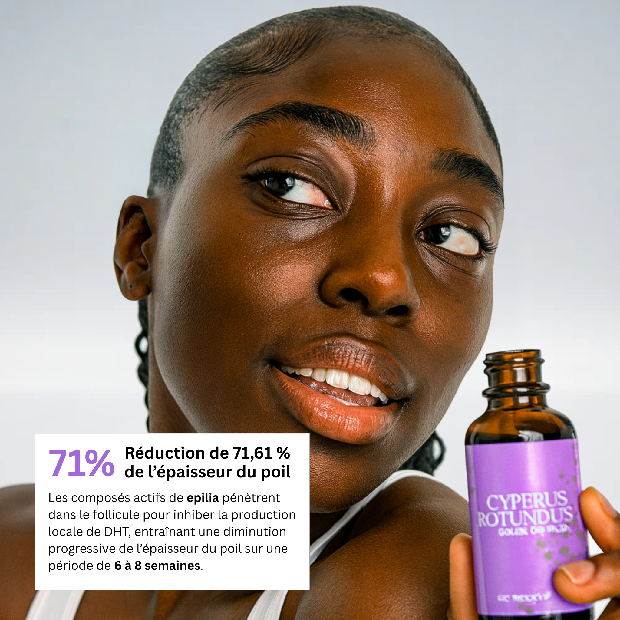L’extrait de Cyperus Rotundus pénètre en profondeur dans la peau, atteignant directement les follicules pileux à la racine, là où débute réellement la croissance du poil. Les composés actifs interfèrent naturellement avec le cycle de croissance du poil, ralentissant progressivement l’activité cellulaire responsable des poils épais et drus.