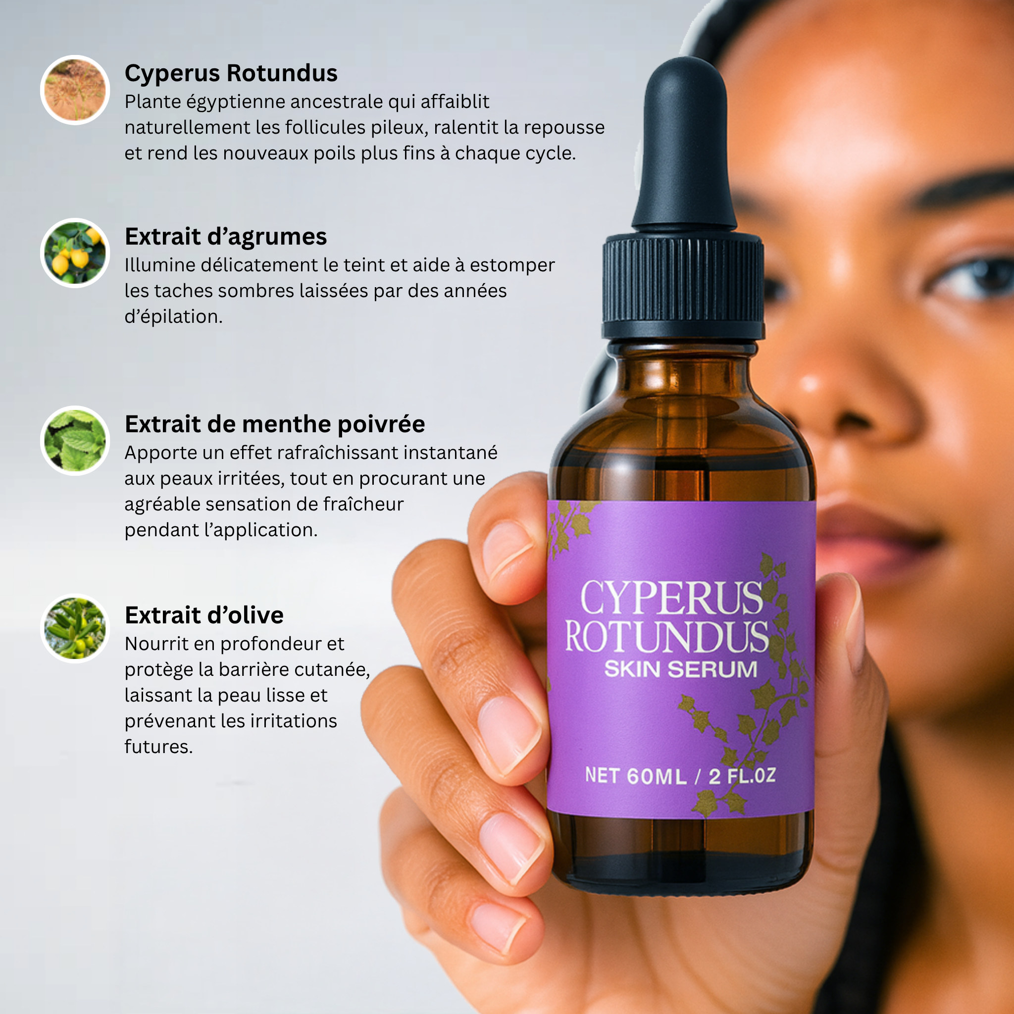 Pas du tout ! Et nous comprenons parfaitement votre inquiétude. Avec tant de produits qui perturbent les hormones, c’est une question légitime. Le sérum au Cyperus Rotundus agit d’une manière totalement différente : il agit doucement au niveau de la peau, grâce à des composés botaniques naturels. Le Cyperus Rotundus est utilisé par les femmes depuis des milliers d’années, sans aucun effet hormonal. Notre formule est enrichie d’ingrédients d’origine végétale : menthe, citron, vitamine E et huile d’olive, rien de synthétique ou de perturbateur. Contrairement à d’autres traitements qui agissent sur tout le corps, ce sérum reste exactement là où vous l’appliquez. Vous pouvez donc l’utiliser en toute confiance, à tout moment : pendant la grossesse, le cycle menstruel, ou simplement pour obtenir une peau plus douce, sans craindre de déséquilibre hormonal. Il soutient le rythme naturel de votre peau tout en réduisant la pilosité indésirable, en douceur et efficacement.